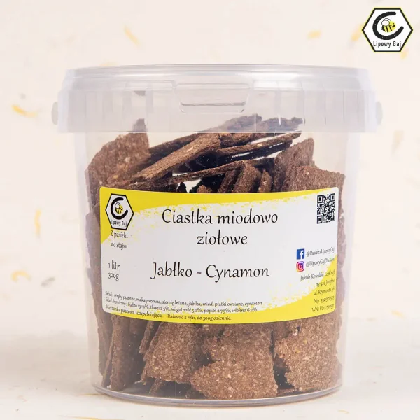 otręby pszenne, mąka pszenna, miód z naszej pasieki, jabłka, siemię lniane, płatki owsiane + zioło charakterystyczne dla danej wersji smakowej.