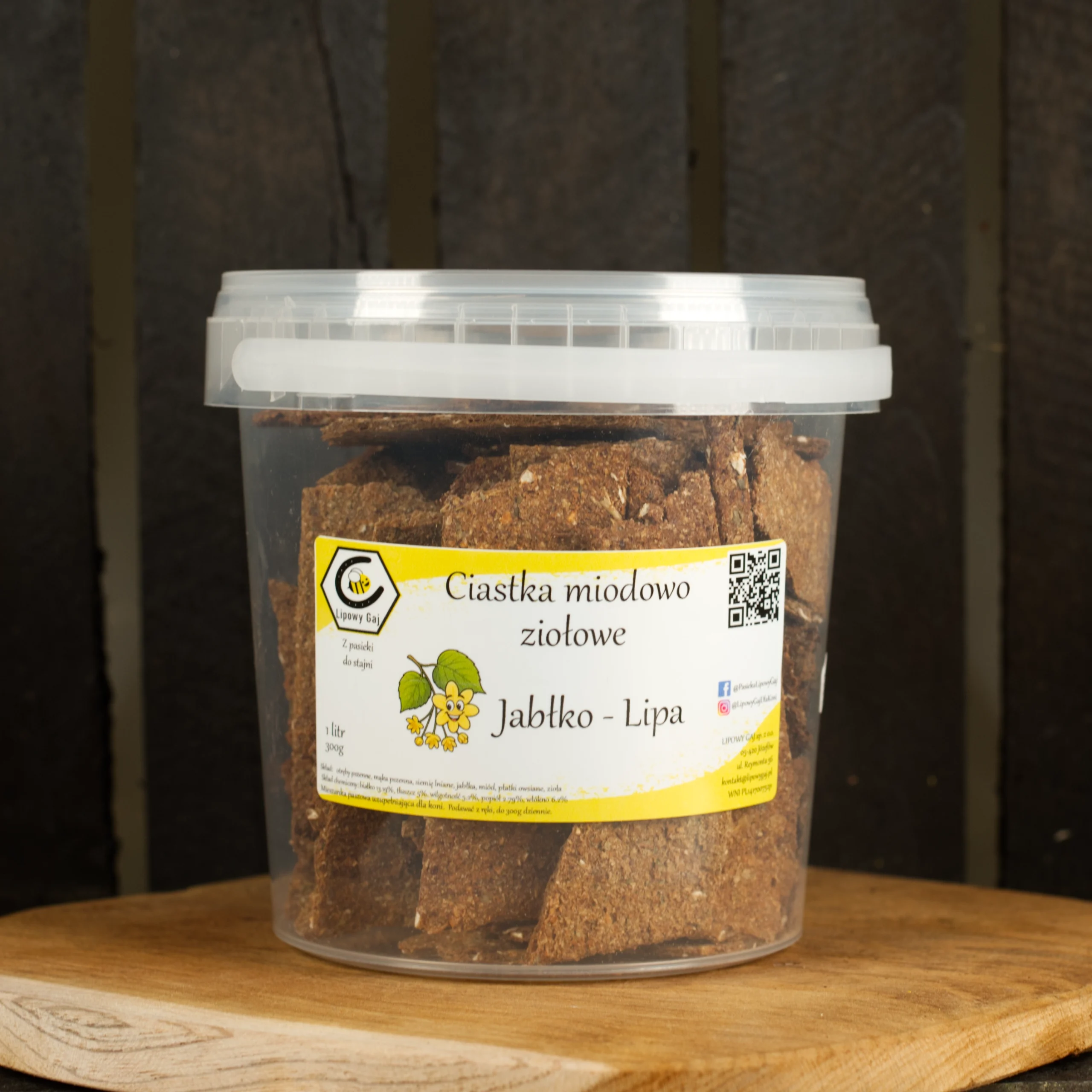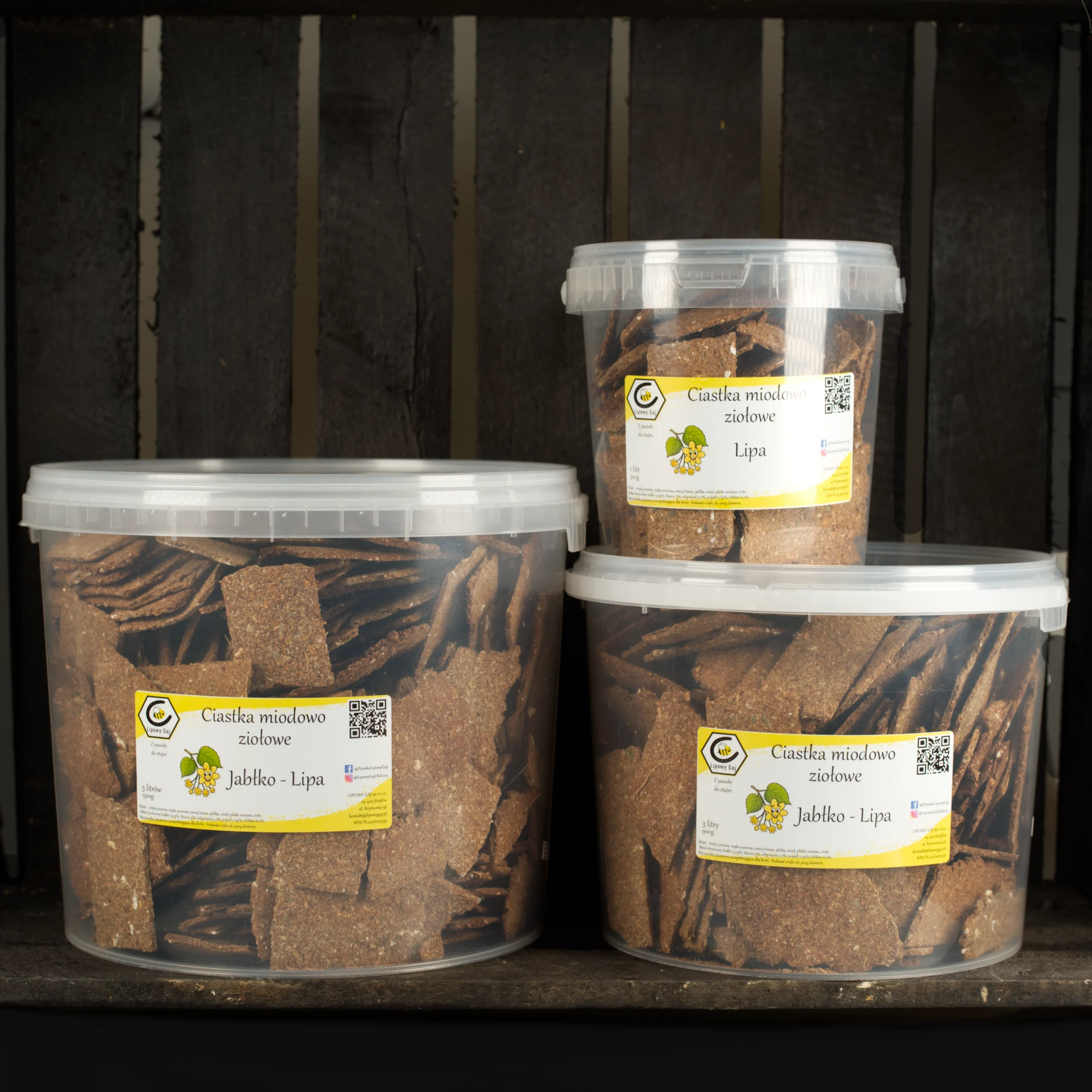 Ciastka są pakowane w praktyczne, szczelne wiaderka o pojemności 1, 3 i 5 litrów – idealne do przechowywania w stajni, nawet w bardziej wymagających warunkach. Dzięki temu długo zachowują świeżość, chrupkość i aromat.