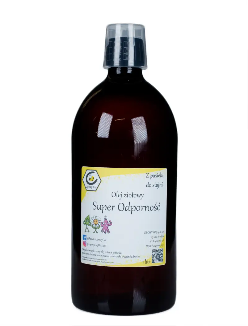Olej ziołowy „Super Odporność” to potężne połączenie przeciwzapalnych kwasów Omega-3 z naszym świeżo tłoczonym olejem lnianym oraz zestawem ziół immunostymulujących. Proces maceracji pozwala na wyciągnięcie z roślin składników rozpuszczalnych w tłuszczach, które budują odporność na poziomie komórkowym. To produkt dla właścicieli, którzy chcą wzmocnić konia długofalowo, dbając o jego barierę ochronną od środka.