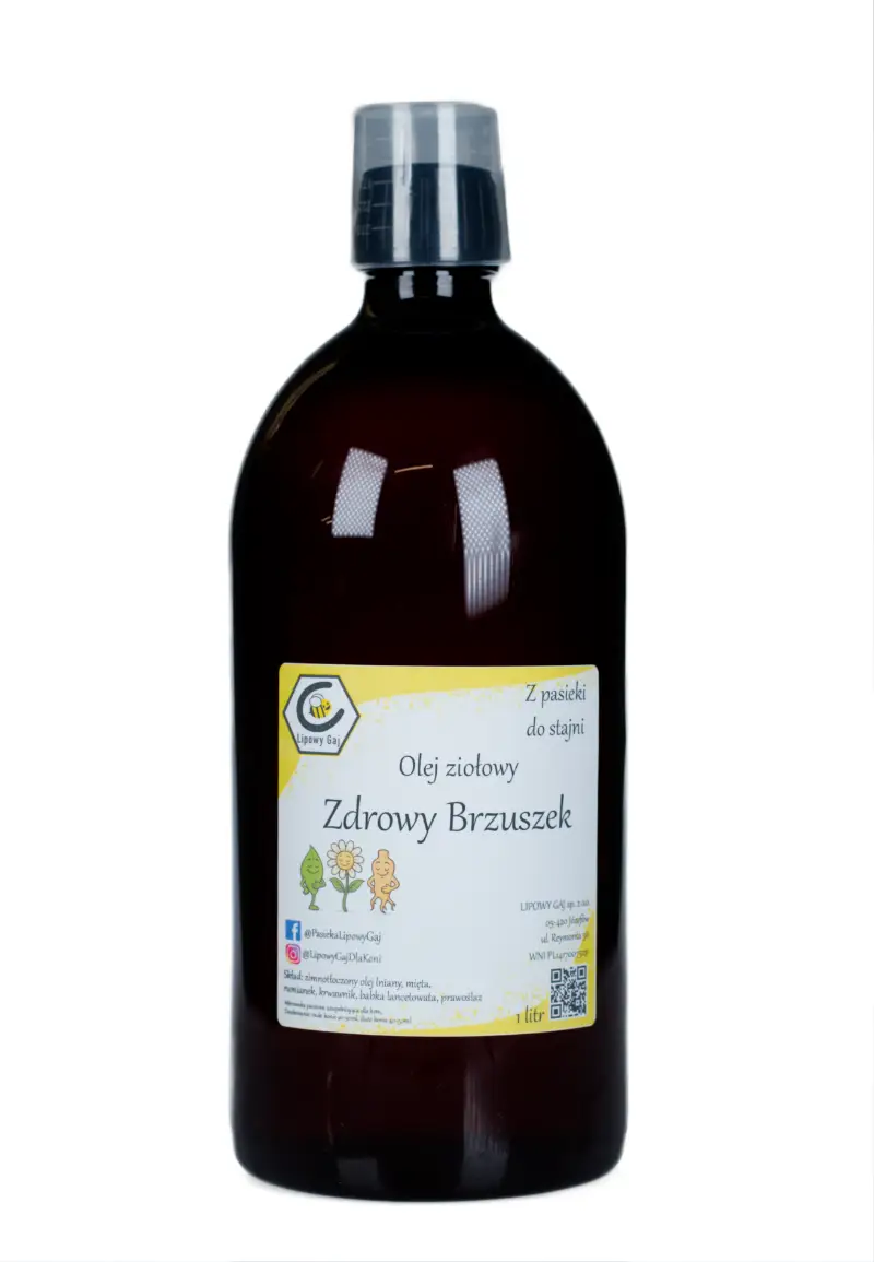 Olej ziołowy „Zdrowy Brzuszek” to połączenie łagodzącej mocy ziół z regeneracyjnymi właściwościami naszego świeżo tłoczonego oleju lnianego. Olej lniany jest kluczowy w diecie koni z wrażliwym układem pokarmowym, a w połączeniu z maceratami ziołowymi staje się kompletnym wsparciem dla zdrowia jelit. Nasz olej dostarcza śluzów i cennych kwasów tłuszczowych, które wyciszają stany zapalne wewnątrz organizmu.